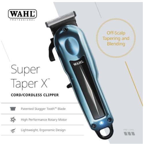 The NEW Wahl Cordless Super Taper X, a direct upgrade from a barbershop classic, features advanced blade technology and a powerful motor, all within a lightweight clipper that is ideal for off-scalp blending and shaping.